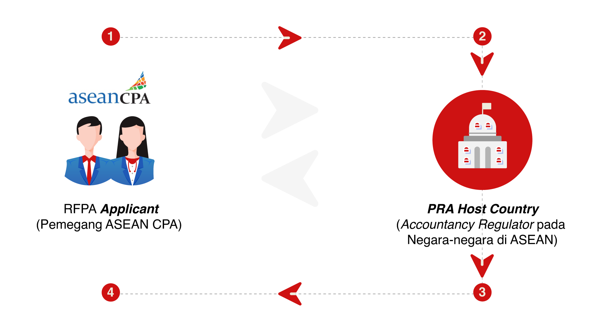 Dalam rangka menjalankan kesepakatan dalam dokumen MRA Akuntansi ASEAN, Indonesia melalui Kementerian Keuangan c.q. Pusat Pembinaan Profesi Keuangan (PPPK) merupakan unit yang akan memproses pendaftaran RFPA untuk dapat bekerja di Indonesia.